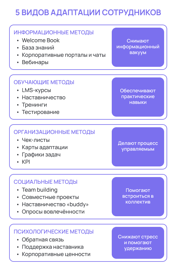Именно поэтому в адаптации критически важны информационные и обучающие методы. Они отвечают на вопросы «что знать» и «как делать».