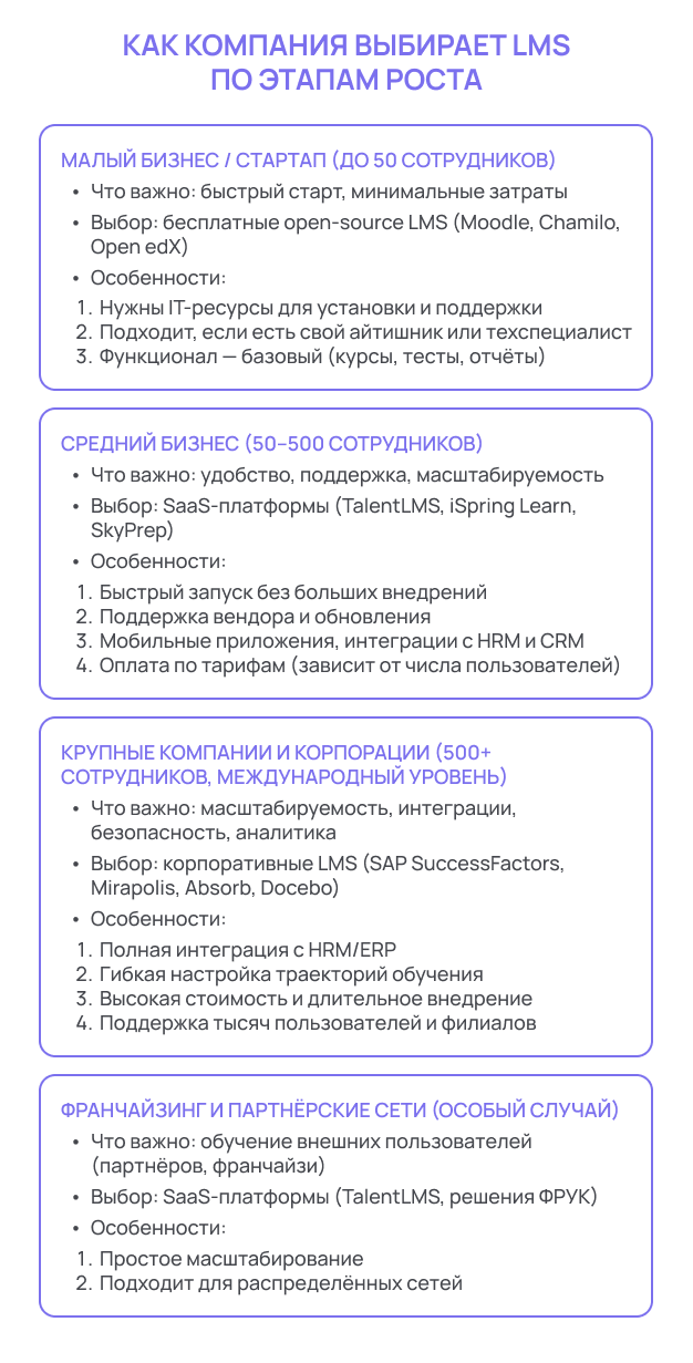 Выбор LMS зависит от размера бизнеса, бюджета и целей.