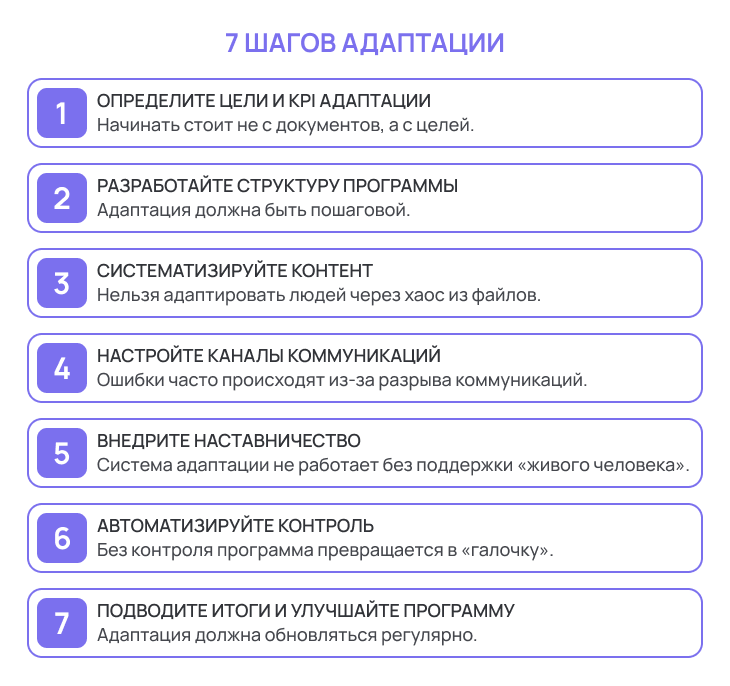 Мы разобрали, что такое адаптация, какие виды она включает и где компании чаще всего допускают ошибки. Теперь логично задать вопрос: как построить систему адаптации так, чтобы она реально работала? Ниже — поэтапный план и конкретные инструменты, которые делают процесс прозрачным, управляемым и выгодным.